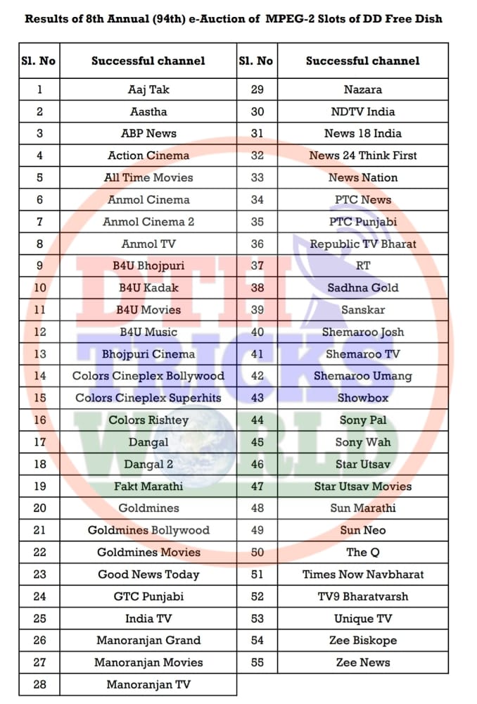 Hi Friends, Prasar Bharati held 94th E-Auction (8th Annual E-Auction) from 16th February 2026 for DD FREE DISH MPEG-2 Slots. Today 24th February 2026, Prasar Bharati announced 94th E-Auction Official results. Total 55 channels won successfully in this E-Auction. Winner channels name given below.